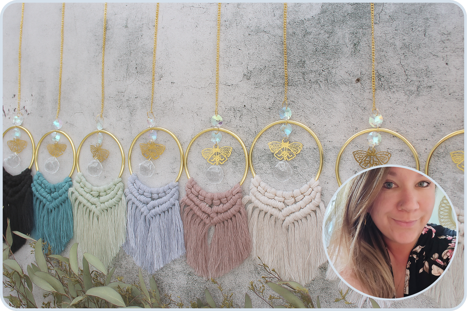 Je crée à la main des pièces en macramé et des capteurs de soleil avec cristaux et bijoux vintage — des créations qui apportent lumière, sérénité et un brin de magie dans chaque maison.