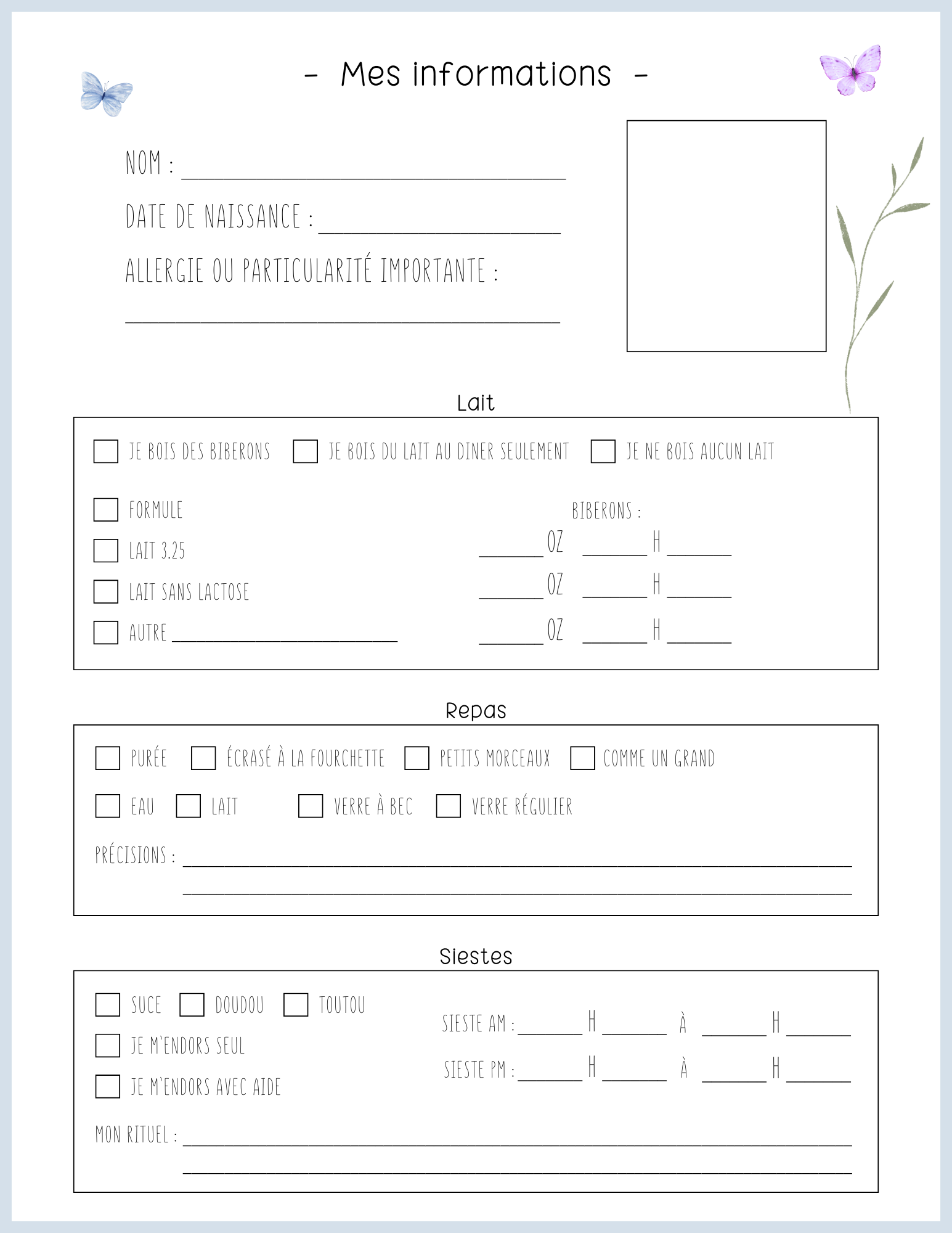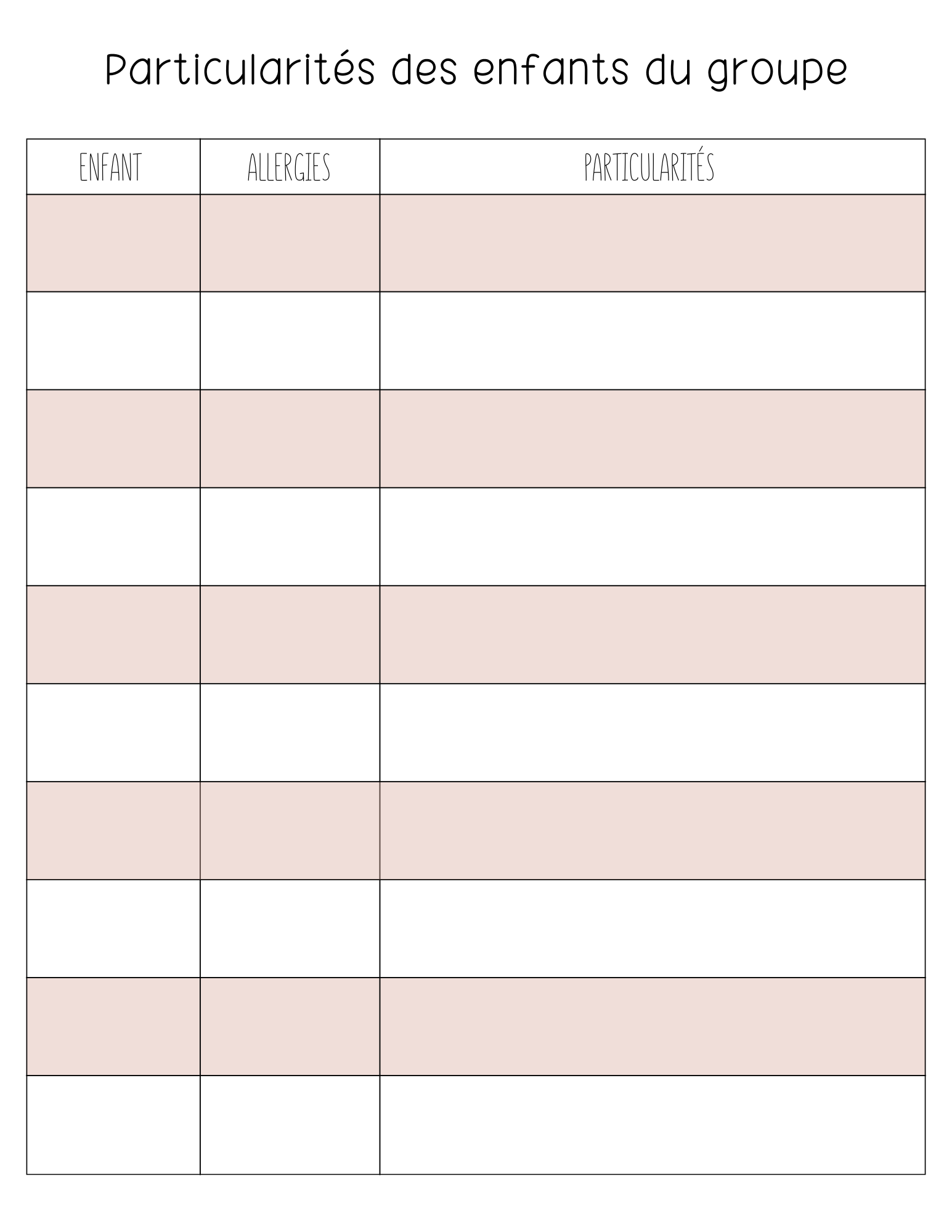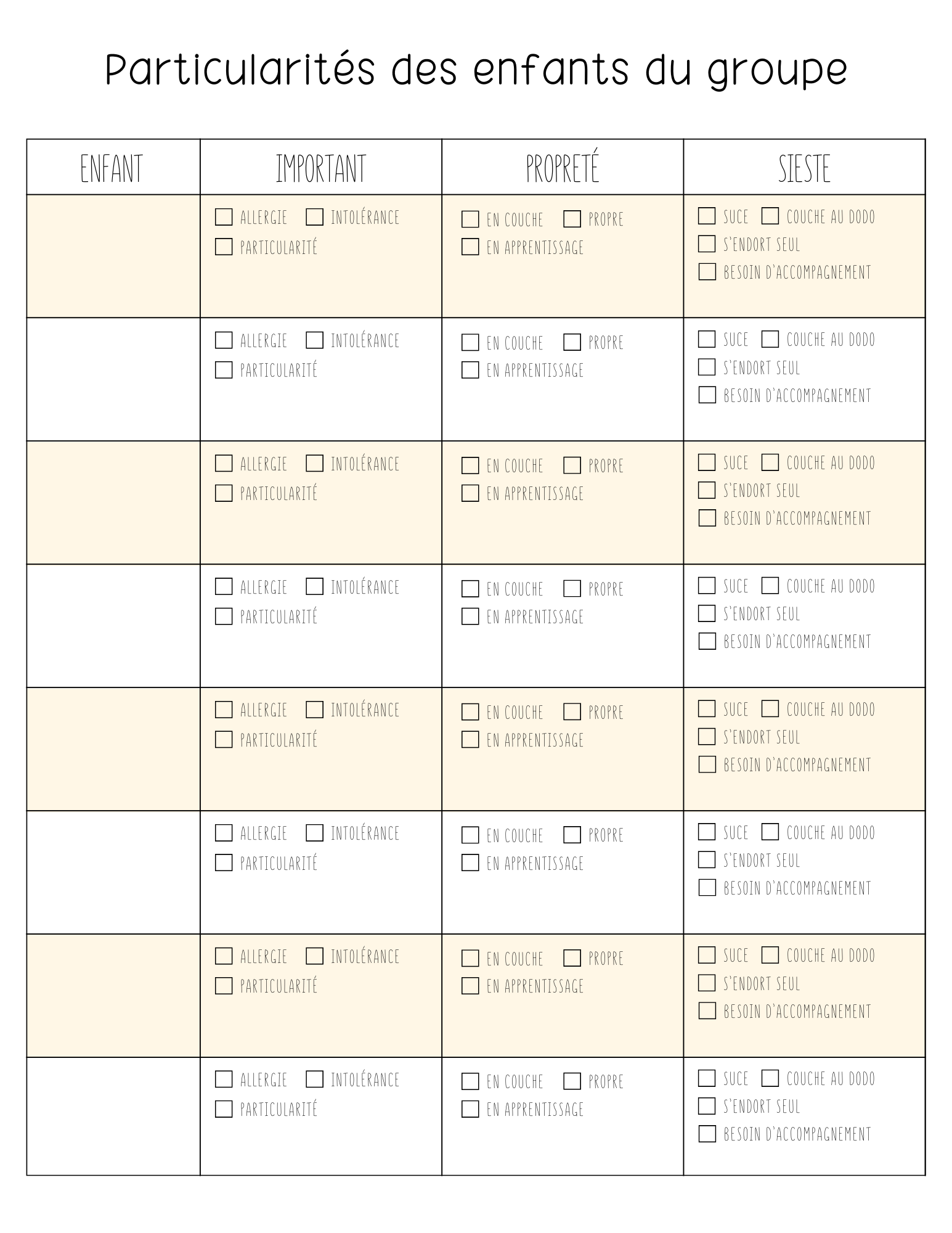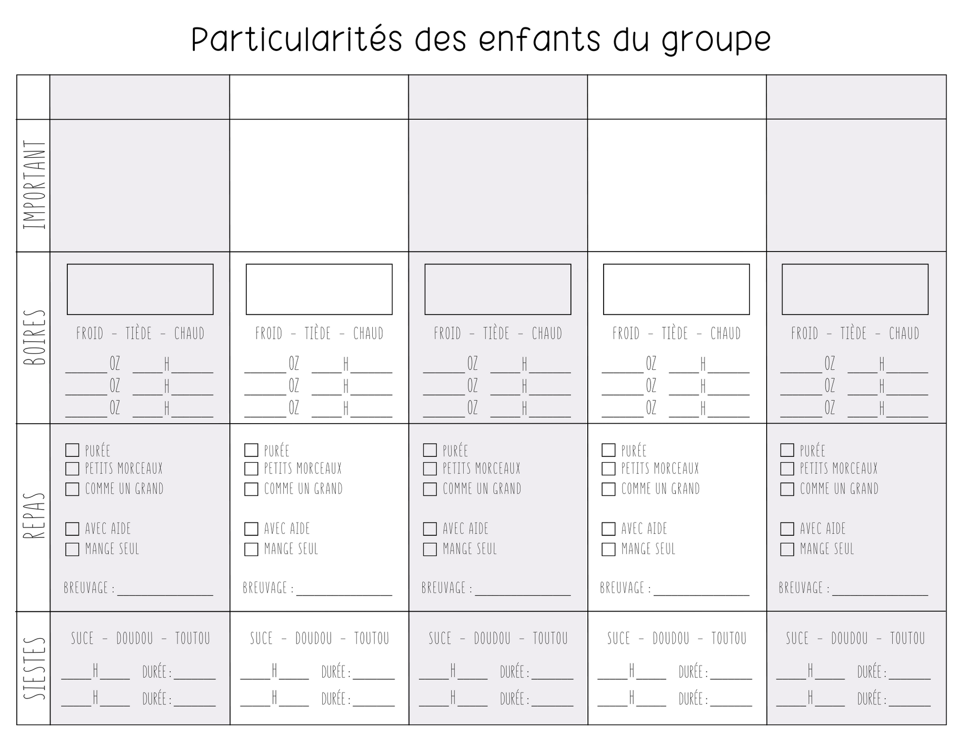 CANVA - Tableau des particularités (Pouponnière - Fiches individuelles)
